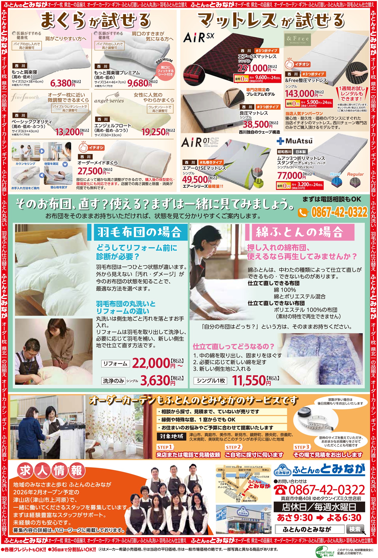 2026年1月4日9:30スタート!新春初売り 【岡山県北 岡山県真庭市にあるオーダー枕と寝具の専門店 ふとんのとみなが】 オーダー枕・マットレス・羽毛布団・羽毛布団のリフォーム・仕立て直し・オーダーカーテンブラインド・電動ベッド・ベッド・レンタル布団 営業時間 9:30~18:30 定休日 水曜日 TEL:0867-42-0322 オーダー枕作成・寝具のご相談ご予約はこちら ふとんのとみながインターネットショッピングはこちらふとんのとみなが公式インスタグラムはコチラからふとんのとみなが公式フェイスブックはコチラから 有限会社富永ふとん店 岡山県真庭市中島408 中国自動車道 落合ICより車で約7分 米子自動車道 久世ICより車で約7分 JR姫新線 久世駅より徒歩15分津山城や昔ながらの街並みが残る城下町、津山市まで車で30分!