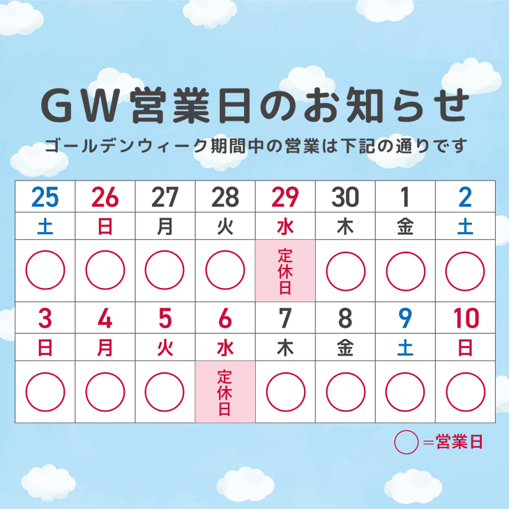 【営業カレンダー】ゴールデンウィークも、いつも通りお待ちしています